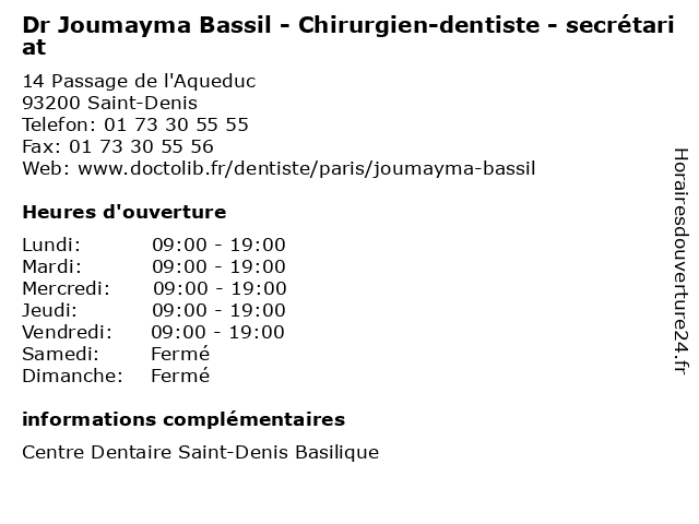 1 Dr Jean Bassil - Chirurgien-dentiste (Distance: 0,01 km) 14 Passage de l'Aqueduc, 93200 Saint-Denis bassil, chirurgien, consultation, dentiste, docteur, dr, jean, med, médecin, traitement 2 Dr Raymond Bassil - Chirurgien-dentiste (Distance: 7,19 km) 34 Boulevard de Strasbourg, 75010 Paris bassil, chirurgien, consultation, dentiste, docteur, dr, med, médecin, raymond, traitement 3 Dr Jean Bassil - Chirurgien-dentiste - secrétariat (Distance: 7,90 km) 57 Rue Armand Silvestre, 92400 Courbevoie bassil, chirurgien, consultation, dentiste, docteur, dr, jean, med, médecin, médecine, secrétariat, traitement 4 Dr Jean Bassil - Chirurgien-dentiste (Distance: 8,13 km) 29 Rue François Mitterrand, 93170 Bagnolet bassil, chirurgien, dentiste, dr, jean, médecin, médecine, médical, pharmaceutique, secrétariat, traitement 5 Dr Tony Bassil - Chirurgien-dentiste (Distance: 8,66 km) 116 Rue de Rivoli, 75001 Paris bassil, chirurgien, consultation, dentiste, docteur, dr, med, médecin, tony, traitement 6 Dr Bassil - Chirurgie Dentaire (Distance: 10,08 km) 2 Rue armand carrel, 93100 Montreuil bassil, chirurgie, chirurgie dentaire, dentaire, docteur, dr, montreuil |