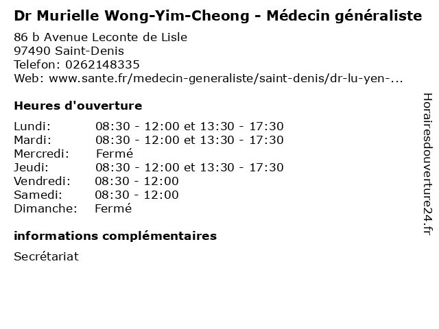 1 Dr Ludovic Chane-Wet - Médecin généraliste (Distance: 0,33 km) - Avenue Joseph Bedier, 97490 Saint-Denis chane, consultation, docteur, dr, généraliste, ludovic, med, médecin, traitement, wet 2 Dr Mohammad Siddick Goburdhun - Médecin généraliste (Distance: 0,41 km) - Rue Roger Payet, 97490 Saint-Denis consultation, docteur, dr, goburdhun, généraliste, med, mohammad, médecin, siddick, traitement 3 Dr Jean Kapler - Médecin généraliste (Distance: 0,52 km) 43 a Route de Moufia, 97490 Saint-Denis consultation, docteur, dr, généraliste, jean, kapler, med, médecin, traitement 4 Dr Pascal Klein - Médecin généraliste (Distance: 0,89 km) 4 Rue lory les hauts, Sainte-Clotilde, 97490 Réunion docteur, dr, generaliste, généraliste, klein, medical, médecin, pascal, soin 5 Dr Patrick Lombardo - Médecin généraliste (Distance: 1,02 km) - Avenue Leconte de Lisle, 97490 Saint-Denis consultation, docteur, dr, généraliste, lombardo, med, médecin, patrick, traitement 6 Dr Marie-Margaret Ramassamy - Médecin généraliste (Distance: 1,02 km) - Avenue Leconte de Lisle, 97490 Saint-Denis consultation, docteur, dr, généraliste, margaret, marie, med, médecin, ramassamy, traitement |