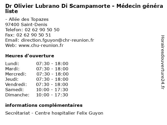 1 Dr Servane Di Bernardo - Médecin généraliste (Distance: 0,00 km) - Allée des Topazes, 97400 Saint-Denis bernardo, consultation, di, docteur, dr, généraliste, med, médecin, servane, traitement 2 Dr Olivier Favre - Gastro-entérologue et hépatologue (Distance: 0,00 km) - Allée des Topazes, 97400 Saint-Denis consultation, docteur, dr, entérologue, et, favre, gastro, hépatologue, med, médecin, olivier, traitement 3 Dr Olivier Dunand - Pédiatre (Distance: 0,60 km) - Allée des Topazes, 97400 Saint-Denis bebe, chu, denis, dr, dunand, felix, guyon, nourisson, olivier, pédiatre, pédiatrie, saint 4 Mezzo Di Pasta (Distance: 1,10 km) 14 rue du Général de Gaulle, 97438 Sainte-Marie boutique, commerce, di, enseigne, mezzo, pasta, pâtes, restauration, vente 5 Salon Olivier Rinaldi (Distance: 1,22 km) 40 Rue de Paris, 97400 Saint-Denis beauté, coiffure, coiffures, coloristes, olivier, rinaldi, salon 6 Dr. Olivier Borson - Radiologue (Distance: 1,73 km) 31 rue Maréchal Leclerc, 97400 Saint-Denis borson, consultation, docteur, dr., med, médecin, médecine, olivier, radiologue, traitement |