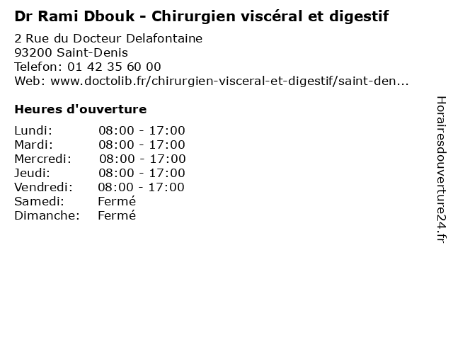 1 Pr Jean-Marc Catheline - Chirurgien viscéral et digestif (Distance: 0,00 km) 2 Rue du Docteur Delafontaine, 93200 Saint-Denis catheline, chirurgie, chirurgien, consultation, digestif, docteur, et, jean, marc, medecins, pr, rendez, santé, sur, viscéral, viscérale, vous 2 Dr Dominique Mariette - Chirurgien viscéral et digestif (Distance: 0,07 km) 2 rue du Docteur Delafontaine, 93205 Saint-Denis chirurgien, consultation, digestif, docteur, dominique, dr, et, mariette, med, médecin, médecine, traitement, viscéral 3 Dr Yamina Ladjici Amiar - Chirurgien viscéral et digestif (Distance: 2,09 km) 35 Rue d'Amiens, 93240 Stains amiar, chirurgien, consultation, digestif, docteur, dr, et, ladjici, med, médecin, médecine, secrétariat, traitement, viscéral, yamina 4 Dr Alina Parvanescu - Chirurgien viscéral et digestif (Distance: 5,45 km) 31 Rue Pajol, 75018 Paris alina, chirurgien, digestif, dr, et, médecin, médecine, médical, parvanescu, pharmaceutique, traitement, viscéral 5 Medecin Faycal Hafdi (Chirurgien viscéral) (Distance: 5,51 km) 5B Rue du Square, 92230 Gennevillers chirurgien, docteur, faycal, hafdi, medecin, sante, services, viscéral 6 Dr Nazih Soukhni - Chirurgien viscéral et digestif (Distance: 5,56 km) 3 Rue de la Paix, 92230 Gennevilliers chirurgien, consultation, digestif, docteur, dr, et, med, médecin, médecine, nazih, soukhni, traitement, viscéral |