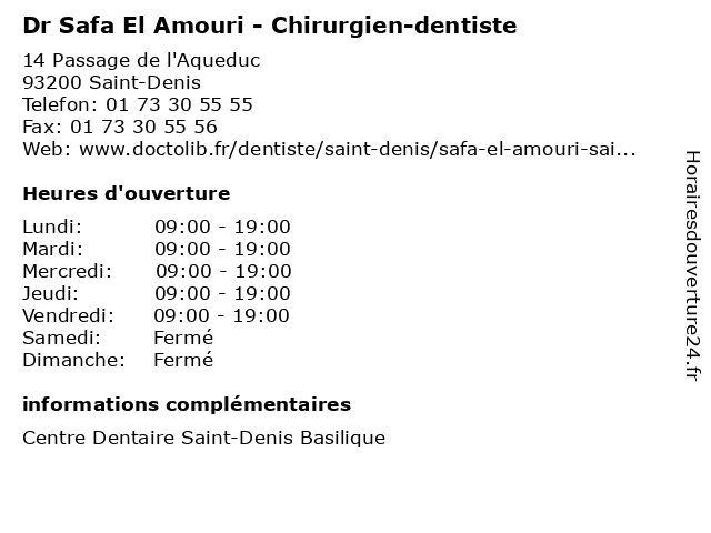 1 Baraa EL Hasni - Orthoptiste - Secretariat (Distance: 0,14 km) 6 Rue Albert Walter, 93200 Saint-Denis baraa, cabinets, el, hasni, médecins, orthoptiste, secretariat, thérapies 2 Maître Rachid El Hailouch - Avocat (Distance: 0,26 km) 26 Rue de la République, 93200 Saint Denis avocat, avocats, civils, droits, el, hailouch, juridiques, maître, rachid 3 Dr Mohamed El Fadhel El Hami - Chirurgien-dentiste (Distance: 0,62 km) 1 Avenue Lénine, 93200 Saint-Denis chirurgien, dentaire, dentiste, dr, el, fadhel, hami, implantologie, mohamed, parodontologie 6 Dr Latifa El Kaidi - Chirurgien-dentiste (Distance: 0,87 km) 85/87 Rue de Strasbourg, 93200 Saint-Denis chirurgie, chirurgien, dentaire, dentiste, dr, el, kaidi, latifa |