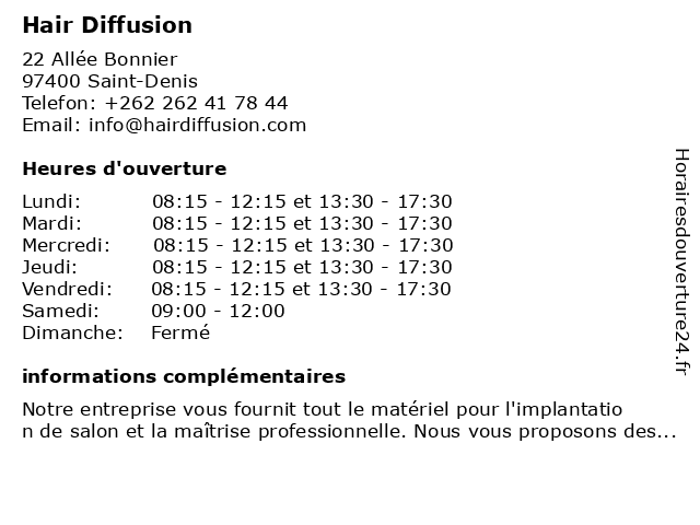 | Lundi | 08:15-12:15 et 13:30-17:30 |