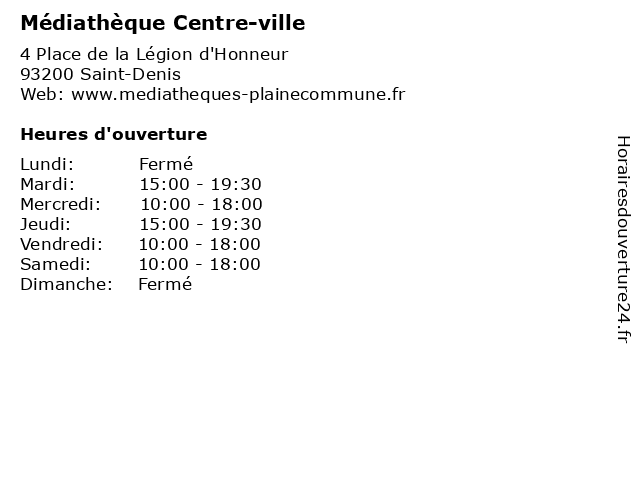 1 Médiathèque Centre-ville (Horaires vacances scolaires) (Distance: 0,00 km) 4 Place de la Légion d'Honneur, 93200 Saint-Denis bibliothèque, centre, horaires, livre, médiathèque, scolaires, services, vacances, ville 2 Médiathèque Aladin (Distance: 1,08 km) 2 Rue Henri Barbusse, 93200 Saint-Denis aladin, bibliothèque, livre, médiathèque, services 3 Médiathèque Gulliver (Distance: 2,10 km) 7 Rue du Plouich, 93200 Saint-Denis bibliothèque, gulliver, livre, médiathèque, services 4 Médiathèque Edmond Rostand (Distance: 6,53 km) 11 rue Nicolas Chuquet, 75017 Paris bibliothèque, edmond, joyeuse, l'heure, livre, médiathèque, rostand, services 5 Médiathèque Edmond Rostand / jeunesse (Distance: 6,53 km) 11 rue Nicolas Chuquet, 75017 Paris bibliothèque, edmond, jeunesse, joyeuse, l'heure, livre, médiathèque, rostand, services 6 Médiathèque Françoise Sagan (Distance: 6,60 km) 8 Rue Léon Schwartzenberg, 75010 Paris bibliothèque, françoise, livre, médiathèque, sagan, services |