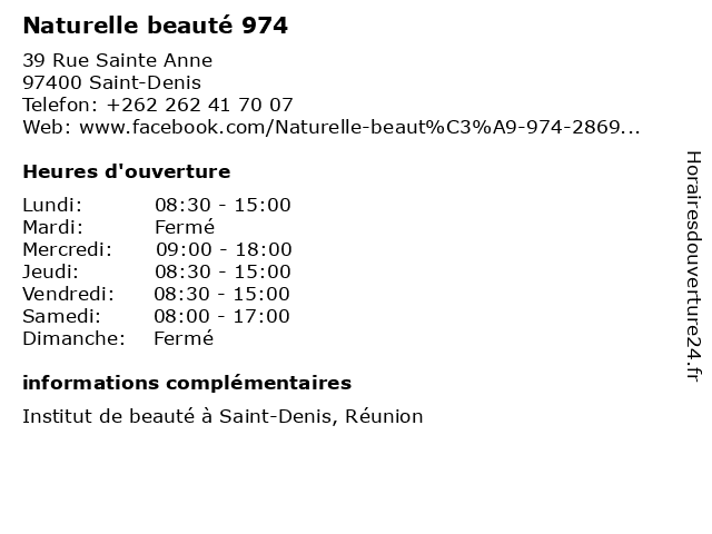 1 Natur'Elle Beauté (Distance: 0,22 km) 39 rue Sainte Anne, 97400 Saint-Denis beauté, esthétique, institut, manucure, natur'elle, onglerie, épilation 3 Réserve Naturelle (Distance: 0,54 km) 2 Rue Victor Mac Auliffe, 97400 SAINT-DENIS accessoires, beauté, magasin, maquillage, naturelle, parfums, réserve 5 CSP Saint-Denis - SDIS 974 (Distance: 1,14 km) 1 Ruelle Tadar, 97400 Saint-Denis 974, csp, denis, lutte contre les incendies, pompier, protection, prévention, saint, sdis, secours 6 CPI La Montagne - SDIS 974 (Distance: 2,60 km) 8 rue des Palmiers, 97417 La Montagne 974, cpi, la, lutte contre les incendies, montagne, pompier, protection, prévention, sdis, secours |