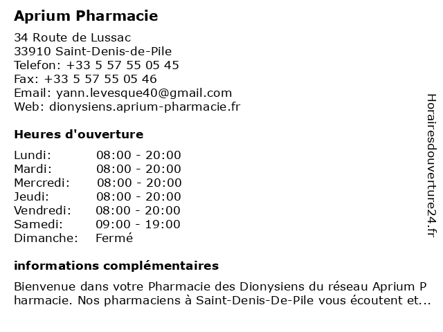 1 Aprium Pharmacie Vergnet Blandeau (Distance: 28,48 km) Avenue Carnot, 33310 Lormont aprium, blandeau, pharmacie, vergnet 2 Aprium Pharmacie Bordeaux Lac (Distance: 31,20 km) Avenue des 40 Journaux, 33300 Bordeaux aprium, bordeaux, lac, pharmacie 3 APRIUM Pharmacie Saint Louis (Distance: 32,21 km) 198 Cours Saint-Louis, 33300 Bordeaux 33300, aprium, bordeaux, conseil, louis, pharmacie, saint, saint louis, test antigénique, vaccination 4 Aprium Pharmacie de la Renney (Distance: 34,63 km) 102 Avenue du 11 Novembre, 33290 Blanquefort 33290, aprium, aromathérapie, beauté, blanquefort, compléments alimentaires, covid-19, de, homéopathie, hygiène orale, la, matériel médical, médicaments, orthopédie, parapharmacie, pharmacie, pharmacie bio, produits vétérinaires, renney, test antigéniques, vaccination, équipements médicaux 5 Aprium Pharmacie Lassabe (Distance: 35,35 km) 6 Place de l'Église, 33290 Blanquefort aprium, aromathérapie, beauté, compléments alimentaires, covid-19, depistage, homéopathie, hygiène orale, lassabe, matériel médical, médicaments, orthopédie, parapharmacie, pharmacie, pharmacie bio, produits vétérinaires, tests antigéniques, tests serologiques, vaccination, équipements médicaux 6 Aprium PHARMACIE DES HALLES (Distance: 36,65 km) 2 Place Jean Jaurès, 33220 Sainte-Foy-la-Grande 33220, aprium, aromathérapie, beauté, compléments alimentaires, covid-19, des, halles, homéopathie, hygiène orale, matériel médical, médicaments, orthopédie, parapharmacie, pharmacie, pharmacie bio, produits vétérinaires, sainte foy la grande, test antigéniques, vaccination, équipements médicaux |