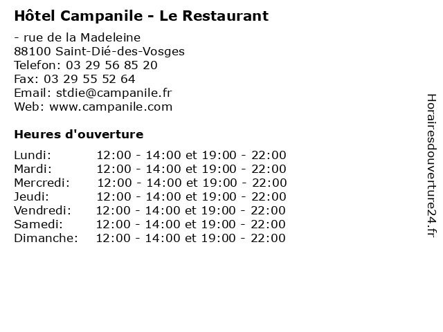 | Dimanche | 12:00-14:00 et 19:00-22:00 |
