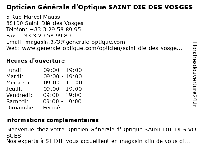 1 Opticien Krys (Distance: 0,12 km) Centre Commercial Leclerc, 88100 Saint Die Des Vosges krys, magasin de lentilles correctrices, magasin de lunettes de soleil, magasin d’accessoires de mode, opticien, optométrie 2 Opticien SAINT DIE DES VOSGES Générale d'Optique (Distance: 0,20 km) 5 Rue Marcel Mauss, 88100 Saint-Dié-des-Vosges d'optique, des, die, examen de la vue, générale, lentilles de contact, lentilles progressives, lunette ray ban, lunettes, lunettes anti-lumière bleue, lunettes de conduite de nuit, lunettes de conduites de nuit, lunettes de soleil, lunettes de soleil pour enfant, lunettes de soleil pour femme, lunettes de soleil pour homme, lunettes de vue, lunettes de vue femme, lunettes de vue homme, lunettes progressives, opticien, opticien proche de chez moi, optique, saint, sport à la vue, vosges, vérification de la vue 3 Opticien SAINT-DIÉ-DES-VOSGES Optical Center (Distance: 0,75 km) 4 Rue Alphonse Matter, 88100 Saint-Dié-des-Vosges center, des, dié, optical, opticien, saint, vosges 4 Opticien Krys (Distance: 1,46 km) 56 Rue Thiers, 88100 Saint-dié-des-vosges krys, magasin de lentilles correctrices, magasin de lunettes de soleil, magasin d’accessoires de mode, opticien, optométrie 5 Opticien Saint-Dié-des-Vosges - Optic 2000 (Distance: 1,64 km) 9 Quai du Maréchal Leclerc, 88100 Saint-Dié-des-Vosges 2000, des, dié, lentilles de contact, lunettes de soleil, lunettes de vue, optic, optic2000, opticien, opticien optic2000, ray-ban, rayban, saint, vosges 6 Opticien Générale d'Optique SAINT DIE (Distance: 3,23 km) 463 Rue Ernest Charlier, 88100 Sainte-Marguerite d'optique, die, générale, opticien, saint |
