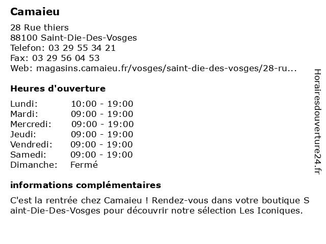 1 Jules St Die (Distance: 0,08 km) 9 Rue Thiers, 88100 ST DIE die, jules, magasin de smokings, magasin de t-shirts, magasin d’accessoires de mode, mode, st 2 Camaieu (Distance: 35,63 km) Rue du buhfeld, 68125 Houssen camaieu, magasin de chaussures, magasin de t-shirts, magasin d’accessoires de mode, maroquinerie, mode 3 Camaieu (Distance: 36,26 km) 33 Rue du saut le cerf, 88000 Jeuxey camaieu, magasin de chaussures, magasin de t-shirts, magasin d’accessoires de mode, maroquinerie, mode 4 Camaieu (Distance: 37,30 km) Place de la victoire, 67600 Sélestat camaieu, magasin de chaussures, magasin de t-shirts, magasin d’accessoires de mode, maroquinerie, mode 5 Camaieu (Distance: 38,25 km) 17 Rue des clefs, 68000 Colmar camaieu, magasin de chaussures, magasin de t-shirts, magasin d’accessoires de mode, maroquinerie, mode 6 Z Generation (Distance: 39,23 km) 37 rue des Minimes, 88000 Epinal accessories, children 0-14 years, clothing, coats, dresses, generation, hoodies, jackets, jeans pants, pajamas, shirts, shoes, skirts, sweatshirts, t-shirts |