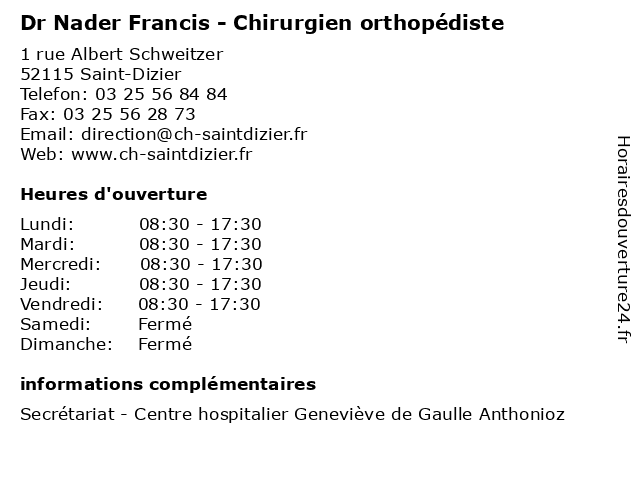 1 Dr Joanna Dzido-Francis - Médecin généraliste (Distance: 0,00 km) 1 rue Albert Schweitzer, 52115 Saint-Dizier consultation, docteur, dr, dzido, francis, généraliste, joanna, med, médecin, médecine, traitement 2 Dr Ghayath Naisse - Chirurgien orthopédiste (Distance: 0,00 km) 1 rue Albert Schweitzer, 52115 Saint-Dizier chirurgien, consultation, docteur, dr, ghayath, med, médecin, médecine, naisse, orthopédiste, traitement 3 Dr Thierry Poncelet - Chirurgien orthopédiste (Distance: 0,00 km) 1 rue Albert Schweitzer, 52115 Saint-Dizier chirurgien, consultation, docteur, dr, med, médecin, médecine, orthopédiste, poncelet, thierry, traitement 4 Dr Elie Habib - Chirurgien orthopédiste et traumatologue (Distance: 0,06 km) 1 Rue Albert Schweitzer, 52100 Saint-Dizier chirurgie, chirurgien, dr, elie, et, general, habib, orthopédiste, soins, traumatologue 5 Dr Nader Francis - Chirurgien orthopédiste - secrétariat (Distance: 28,98 km) 14 Rue Abraham de Moivre, 51300 Vitry-le-François chirurgien, dr, francis, médecin, médecine, médical, nader, orthopédiste, pharmaceutique, secrétariat, traitement 6 Dr. Francis Cariou- Dentiste (Distance: 29,22 km) 1 Rue Maugras, 51300 Vitry-le-François cariou, dentiste, docteur, dr., francis, medecins, sante |