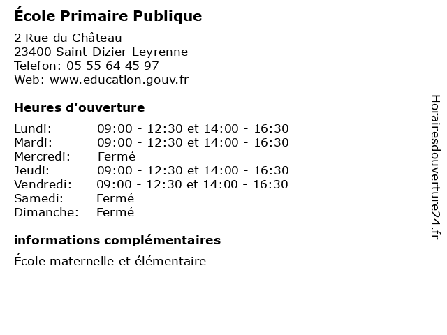 1 École primaire publique (Distance: 8,89 km) . Le Bourg, 23400 Montboucher cours, montboucher, primaire, publique, services, école 2 École primaire publique (Distance: 10,50 km) 17 Rue des écoles, 23320 Montaigut-le-Blanc blanc, cours, le, montaigut, primaire, publique, services, école 3 École primaire publique (Distance: 10,92 km) 1 Place du Château, 23250 Pontarion cours, curie, et, marie, pierre, pontarion, primaire, publique, services, école 4 École primaire publique (Distance: 11,09 km) 20 Rue du Docteur Jamot, 23250 Sardent cours, georges, mercier, primaire, publique, sardent, services, école 5 École primaire publique (Distance: 12,03 km) 3 Place de L'Église, 23210 Bénévent-l'Abbaye bénévent, cours, l'abbaye, primaire, publique, services, école 6 École primaire publique (Distance: 12,57 km) 8 Rue de la Mairie, 23210 Marsac cours, marsac, primaire, publique, services, école |