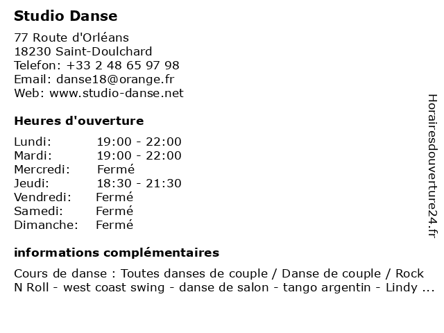 1 Danse Tolerance Et Compagnie (Distance: 1,84 km) 28 Rue Gambon, 18000 Bourges compagnie, danse, et, tolerance 2 Everandyou - Studio Web (Distance: 1,92 km) 7 Rue des 3 Pommes, 18000 Bourges création, everandyou, identité, internet, site, studio, visuelle, web 3 Studio Comme J'Aime (Distance: 3,42 km) - Chaussée de Chappe, 18000 Bourges beauté, centre, comme, j'aime, minceur, soins, studio, équilibrage 5 Temps Danse Bourges Mehun (Distance: 13,63 km) Quai du Canal, 18500 Mehun-sur-Yèvre bourges, danse, mehun, temps 6 Phox (Distance: 2,21 km) 8 Rue Moyenne, 18000 Bourges objet portrait, photos d'identité, photos de mariage, phox, prise de vue en studio, reportage professionnel, reportage événement |