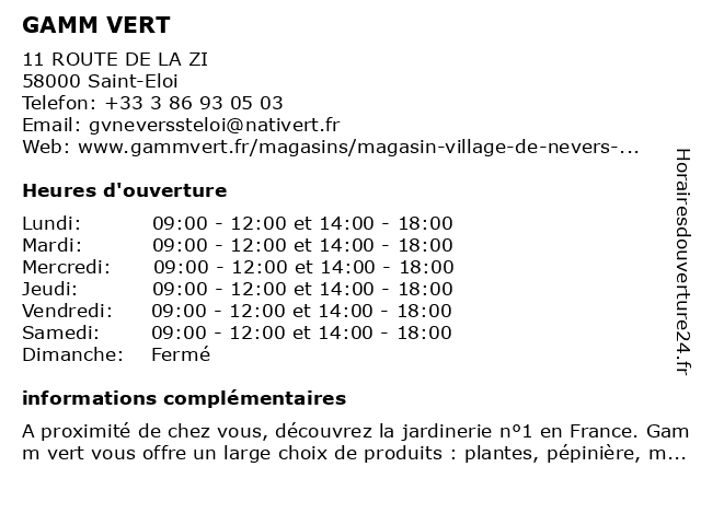 1 Gamm vert (Distance: 0,06 km) 11 La Barbouillere, 58000 Saint-Eloi animalerie, gamm, jardin, jardinerie, mobilier de jardin, plantes, pépinière, vert 2 Gamm Vert (Distance: 2,40 km) . Zone Industrielle de Saint-Eloi, 58000 Nevers animalerie, animaux, gamm, horticulteur, jardin, jardinerie, vert 3 GAMM VERT (Distance: 3,63 km) Rue du 13ème de Ligne, 58000 Nevers animalerie, gamm, jardin, jardinerie, mobilier de jardin, outillage, plantes, pépinière, vert 4 GAMM VERT (Distance: 19,00 km) Rue Georges Carpentier, 18150 La Guerche-sur-l'Aubois animalerie, gamm, jardin, jardinerie, mobilier de jardin, plantes, pépinière, vert 5 Club Vert (Distance: 1,94 km) 21 rue Anthony Duvivier, 58000 Nevers club, de, fitness, musculation, nevers, salle, sport, vert 6 Centre Auto Feu Vert (Distance: 3,49 km) 29 Boulevard Camille Dagonneau, 58640 Varennes-Vauzelles auto, centre, feu, vert |