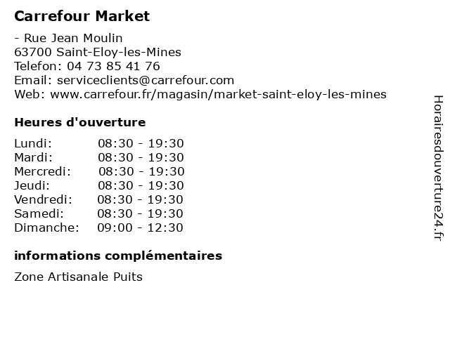 1 Carrefour Market (Distance: 16,56 km) . Rue Edouard Vaillant, 03600 Commentry carrefour, hypermarche, marche, market 2 Carrefour Location (Distance: 0,00 km) - Rue Jean Moulin, 63700 Saint-Éloy-les-Mines agence, carrefour, location, utilitaires, véhicules 3 Carrefour Drive (Distance: 0,00 km) - Rue Jean Moulin, 63700 Saint-Éloy-les-Mines alimentaire, carrefour, courses, drive, en ligne, magasin 4 Carrefour Contact (Distance: 14,68 km) 2 Rue de l'égalité, 63390 Saint Gervais D'Auvergne alimentation, carrefour, contact, magasin discount, market, supermarché 5 Carrefour Location (Distance: 16,56 km) - Rue Édouard Vaillant, 03600 Commentry automobiles, carrefour, déménagements, location, market, véhicules 6 Carrefour Station Service (Distance: 16,56 km) - Avenue Édouard Vaillant, 03600 Commentry carburant, carrefour, essences, gazole, service, services, station |