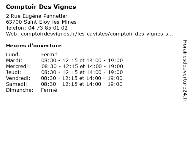 2 Comptoir des Vignes (Distance: 46,67 km) 41 Rue Bonnabaud, 63000 Clermont-Ferrand accompagnement, alcool, anciennete, annee, blanc, comptoir, delices, des, desserts, doux, fort, marque, plats, rouge, subtilite, vignes, vins 3 Comptoir Des Vignes (Distance: 51,01 km) 15 Rue Ernest Jean Bapt, 63370 Lempdes cave, comptoir, conseil, des, vignes, vins 4 Traiteur L'art Des Mets (Distance: 51,35 km) 7 Place du Poids de ville, 63370 Lempdes des, l'art, mets, traiteur 5 Cordonnerie des Mines (Distance: 0,35 km) 218 Rue Jean Jaurès, 63700 Saint-Éloy-les-Mines cordonnerie, des, mines 6 Agence Nationale pour la Garantie des Droits des Mineurs (ANGDM) (Distance: 0,63 km) 44 Rue des Brandes, 63700 Saint-Eloy-Les-Mines agence, angdm, des, droits, garantie, la, mineurs, nationale, pour |