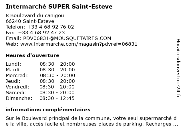 1 Intermarché location Saint-Esteve (Distance: 0,00 km) 8 Boulevard du canigou, 66240 Saint-Esteve esteve, intermarché, location, saint 2 Intermarché station-service Saint-Esteve (Distance: 0,00 km) 8 Boulevard du canigou, 66240 Saint-Esteve esteve, intermarché, saint, service, station 3 Intermarché station-service Saint-Esteve (Distance: 0,81 km) 8 Boulevard du Canigou, 66240 Saint-Estève esteve, intermarché, saint, service, station 4 Super U et Drive (Distance: 3,81 km) 21 Boulevard Docteur Joseph Dénoyes, 66000 Perpignan drive, et, super 5 Intermarché SUPER Le Soler (Distance: 3,97 km) RN 116 Sainte-Eugénie, 66270 Le Soler intermarché, le, soler, super 6 Intermarché station-service Le Soler (Distance: 4,04 km) Sainte-Eugénie, 66270 Le Soler intermarché, le, service, soler, station |