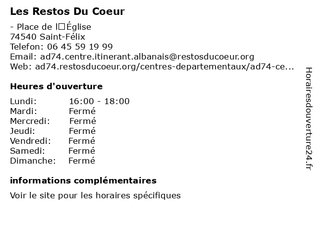 1 Les Restos Du Coeur (Distance: 4,50 km) - Place de la Poste, 74540 Alby-sur-Chéran aides, alimentaire, coeur, du, les, restos, santé, solidarité, soutien 2 Les Restos Du Coeur (Distance: 7,94 km) 16 Avenue Edouard Andre, 74150 Rumilly aides, alimentaire, coeur, du, les, restos, santé, solidarité, soutien 3 Les Restos Du Coeur (Distance: 9,65 km) 801 route d'Aix les Bains, 73310 Chindrieux aides, alimentaire, coeur, du, les, restos, santé, solidarité, soutien 4 Les Restos Du Coeur (Distance: 12,49 km) 25 boulevard des anglais, 73100 Aix-les-Bains aides, alimentaire, coeur, du, les, restos, santé, solidarité, soutien 5 Les Restos Du Coeur (Distance: 15,78 km) 9 Rue de Rumilly, 74000 Annecy aides, alimentaire, coeur, du, les, restos, santé, solidarité, soutien 6 Les Restos Du Coeur (Distance: 19,14 km) - Chemin de Marsay, 74330 La Balme-de-Sillingy aides, alimentaire, coeur, du, les, restos, santé, solidarité, soutien |