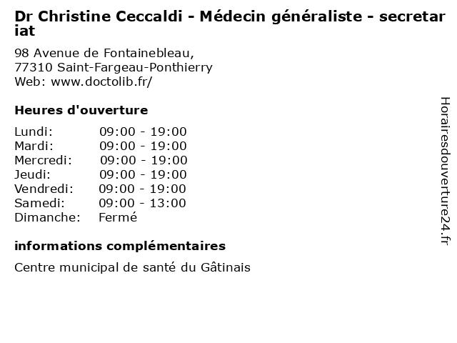 1 Dr Christine Ceccaldi - Médecin généraliste - secrétariat (Distance: 0,00 km) 98 Avenue de Fontainebleau, 77310 Saint-Fargeau-Ponthierry ceccaldi, christine, dr, généraliste, médecin, médecin généraliste, médecins, médicaments, santé, secrétariat, spécialiste 2 Christine Laure (Distance: 5,71 km) 7 Route Nationale, 77195 Villiers-en-Bière accessoires, chaussures, christine, habillement, laure, mode, pret-a-porter, vetements 3 Christine Laure (Distance: 7,75 km) 306 Route Departementale, 77240 Cesson accessoires, chaussures, christine, habillement, laure, mode, pret-a-porter, vetements 4 Christine Laure (Distance: 9,07 km) 3 Allée du Préambule, 77127 Lieusaint accessoires, chaussures, christine, habillement, laure, mode, pret-a-porter, vetements 5 Dr Christine Conti - Pédiatre (Distance: 10,58 km) 40 avenue Serge Dassault, 91106 Corbeil-Essonnes bebe, ch, christine, conti, corbeil, dr, essonnes, francilien, nourisson, pédiatre, pédiatrie, sud 6 Christine Lecomte - Psychologue (Distance: 10,58 km) 40 avenue Serge Dassault, 91106 Corbeil-Essonnes christine, consultation, docteur, lecomte, med, médecin, médecine, psychologue, traitement |