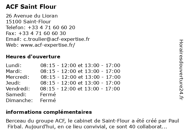 1 ACF St Chély d'Apcher (Distance: 30,58 km) Boulevard Guérin d'Apcher, 48200 Saint-Chély-d'Apcher acf, chély, d'apcher, st 4 ACF AB Gestion (artisan batiment) (Distance: 51,61 km) 15B Avenue des Volontaires, 15000 Aurillac ab, acf, artisan, batiment, gestion |
