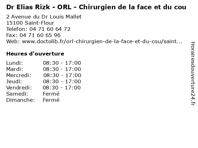 1 CH Saint Flour - ORL (Distance: 0,13 km) 2 Avenue du Dr Mallet, 15100 Saint Flour bureau, ch, consultation, dr, flour, maladie, med, médecin, médecine, orl, pratique, saint, thérapie, traitement 2 Dr. Jean-Emmanuel Monneyron - ORL (Distance: 37,24 km) 2 rue Michel de l'Hospital, 43100 Brioude consultation, docteur, dr., emmanuel, jean, med, monneyron, médecin, médecine, orl, traitement 3 Dr Elias Rizk - ORL (Distance: 52,69 km) 50 Avenue de la République, 15000 Aurillac consultation, docteur, dr, elias, med, médecin, orl, rizk, traitement 4 Dr Sylvie Bouhanna Lénial - ORL - Chirurgien de la face et du cou (Distance: 52,69 km) 50 Avenue de la République, 15000 Aurillac bouhanna, chirurgien, consultation, cou, de, docteur, dr, du, et, face, la, lénial, med, médecin, orl, sylvie, traitement 5 Dr Alexane Lere-Chevaleyre - ORL - Chirurgien de la face et du cou (Distance: 52,69 km) 50 Avenue de la République, 15000 Aurillac alexane, chevaleyre, chirurgien, consultation, cou, de, docteur, dr, du, et, face, la, lere, med, médecin, orl, traitement 6 Dr Julie Massoubre - ORL - Chirurgien de la face et du cou (Distance: 52,69 km) 50 Avenue de la République, 15000 Aurillac chirurgien, consultation, cou, de, docteur, dr, du, et, face, julie, la, massoubre, med, médecin, orl, traitement |