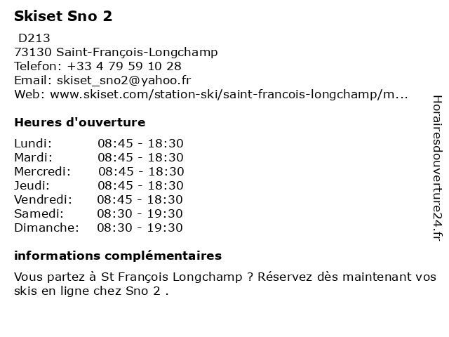 1 Skiset L'Eterlou Sports (Distance: 0,39 km) Place de la Madeleine, 73130 Saint-François-Longchamp l'eterlou, location de ski, location de skis, location matériel de ski, location ski, location skis, skiset, sports 2 Skiset Ski Shop du Hameau (Distance: 0,71 km) Hameau Saint-François, 73130 Saint-François-Longchamp du, hameau, location de ski, location de skis, location matériel de ski, location ski, location skis, shop, ski, skiset 4 Skiset Le Bourg (Distance: 7,60 km) Rue du Bourg, 73260 Les Avanchers-Valmorel bourg, le, location de ski, location de skis, location matériel de ski, location ski, location skis, skiset 6 Skiset Sport Montagne I (Distance: 15,99 km) Route de l'Olympe, 73570 Brides-les-Bains location de ski, location de skis, location matériel de ski, location ski, location skis, montagne, skiset, sport |