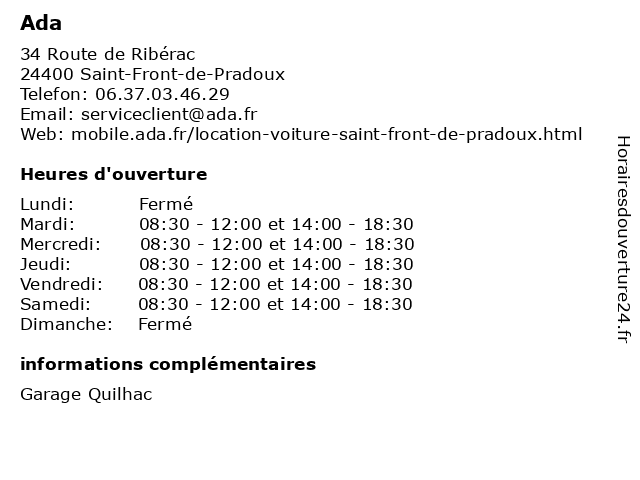 1 Ada (Distance: 17,58 km) 1680 Rue Parrallèle Jevah, 24110 Saint Astier ada, agence, location, services, utilitaires, voitures, voyages 2 Super U Location (Distance: 1,86 km) - Rue du 11 Juin, 24400 Saint Medard de Mussidan agence, location, super, utilitaires, véhicules 3 GiFi Loc (Distance: 23,86 km) - Route de Bordeaux, 24100 Bergerac agence, gifi, loc, location, services, utilitaires, véhicules 4 Ada (Distance: 23,97 km) 68 Rue Clairat, 24100 Bergerac ada, agence, location, services, utilitaires, voitures, voyages 5 Ada (Distance: 27,44 km) 94 Avenue du Périgord, 24230 Saint Antoine De Breuilh ada, agence, location, services, utilitaires, voitures, voyages 6 Relais Poids Lourds - Groupe Brochard (Distance: 27,93 km) . rue de Phoebus, 24660 Notre-Dame-de-Sanilhac brochard, camion, garage, groupe, lourds, poids, relais, réparation, utilitaires, vente |