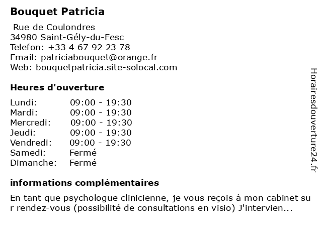 1 Dr Patricia Blanchet - Pédiatre (Distance: 8,05 km) 371 avenue du Doyen Gaston Giraud, 34000 Montpellier blanchet, consultation, docteur, dr, med, médecin, patricia, pédiatre, traitement 2 Dr Patricia Rullier - Spécialiste en médecine interne (Distance: 8,37 km) 80 avenue Augustin Fliche, 34000 Montpellier consultation, docteur, dr, en, interne, med, médecin, médecine, patricia, rullier, spécialiste, traitement 3 Patricia Benitez - Masseur-kinésithérapeute (Distance: 8,94 km) 55 Route de Lodève, 34080 Montpellier benitez, kiné, kinésithérapeute, masseur, patricia, rééducation, soin 4 Dr Patricia Cohen-Faure - Gynécologue obstétricien (Distance: 9,64 km) 25 Rue de Clementville, 34070 Montpellier cohen, consultation, docteur, dr, faure, gynécologue, med, médecin, médecine, obstétricien, patricia, traitement 5 Patricia Izard - Diététicienne (Distance: 10,50 km) 5 Rue de Villefranche, 34090 Montpellier aliment, dieticien, diététicienne, izard, medecin, nutrition, patricia 6 Caroline Bouquet - Psychologue (Distance: 11,95 km) 224 Avenue Jacques Cartier, 34000 Montpellier bouquet, caroline, folie, psychiatre, psychiatrie, psychiatrique, psychologue |
