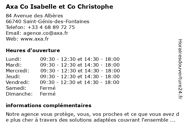 1 AXA Assurance et Banque Co Isabelle Et Co Christophe (Distance: 0,04 km) 84 Avenue des Albères, 66740 Saint-Génis-des-Fontaines assurance, assurance appartement, assurance auto, assurance entreprise, assurance epargne, assurance habitation, assurance maison, assurance professionnelle, assurance santé, assurance voiture, axa, banque, christophe, co, et, isabelle 2 & Co Van (Distance: 2,17 km) 3 Rue Cami De Les Closes, 66740 Villelongue-Dels-Monts co, fournisseur d'équipements de chauffage, magasin d'outils de menuiserie, magasin de batteries de voiture, van 3 Pat Et Co (Distance: 13,02 km) Lotissement 141 Residence Le Neptune, 66750 St Cyprien pat, restaurants 5 Épicerie & Co (Distance: 15,76 km) 13 Rue Saint-Ferréol, 66400 Céret alimentation, co, distributeur alimentaire, supermarché, supérette, vival, épicerie 6 |
