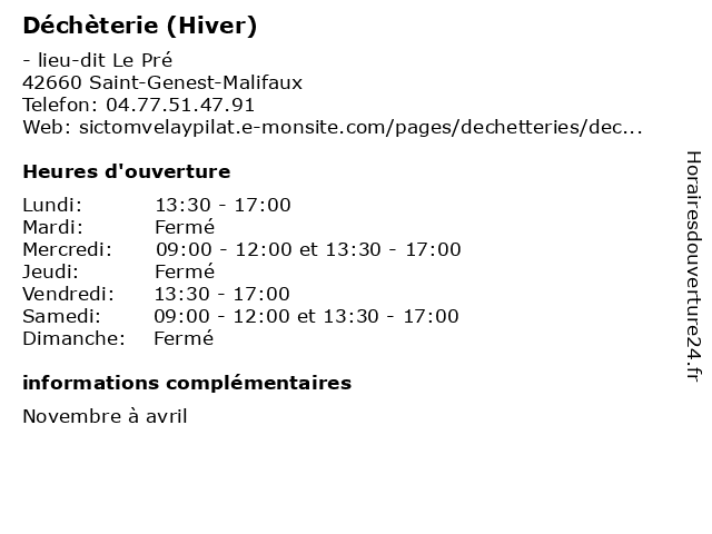 1 Déchèterie (Hiver) (Distance: 8,74 km) - ZA La Font du Loup, 43240 Saint-Just-Malmont collecte, déchets, déchèterie, détritus, gravats, hiver, tri 2 Déchèterie (Hiver) (Distance: 8,97 km) - ZI Montrambert-Pigeot, 42150 La Ricamarie bennes, déchets, déchèterie, détritus, gravats, hiver 3 Déchèterie (Hiver) (Distance: 9,72 km) - Rue Martin Luther King, 42100 Saint-Etienne bennes, déchets, déchèterie, détritus, gravats, hiver 4 Déchèterie (Hiver) (Distance: 11,07 km) - lieu-dit Le Noharet, 42220 Bourg-Argental bennes, déchets, déchèterie, détritus, gravats, hiver 5 Déchèterie (Hiver) (Distance: 12,45 km) - Rue Basse Ville, 42700 Firminy bennes, déchets, déchèterie, détritus, gravats, hiver 6 Déchèterie (Hiver) (Distance: 13,10 km) - Rue Gruner, 42230 Roche-la-Molière bennes, déchets, déchèterie, détritus, gravats, hiver |