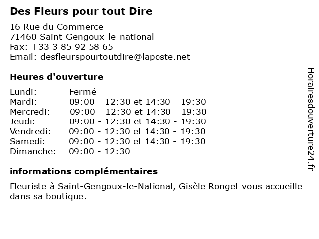 | Lundi | Fermé |