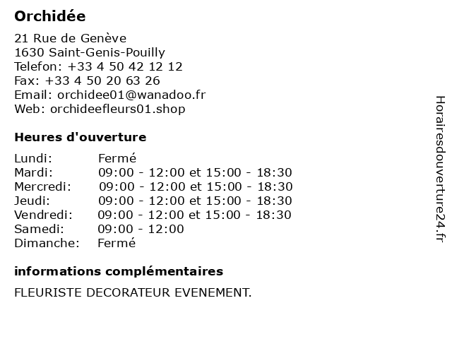 1 L'Orchidée/Ets Voichot (Distance: 24,62 km) 1 ter Rue Jean Moulin, 39170 Coteaux du Lizon l'orchidée/ets, voichot 2 L'Orchidée Virginie (Distance: 48,22 km) 1259 Avenue d’Abondance, 74500 Neuvecelle bouquets, composition, fleuristes, fleurs, l'orchidée, virginie |