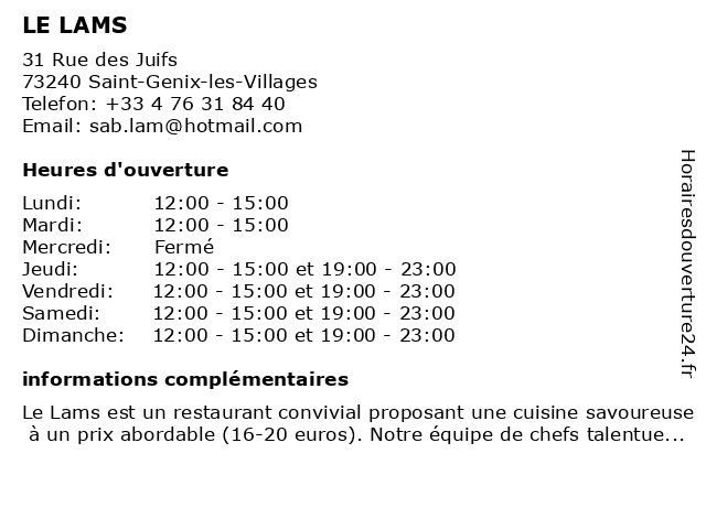 Le Lams est un restaurant convivial proposant une cuisine savoureuse à un prix abordable (16-20 euros). Notre équipe de chefs talentueux travaille avec des ingrédients frais et de qualité pour ...