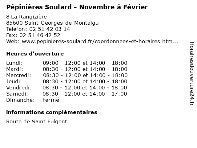 1 Pépinières Soulard (Novembre à Février) (Distance: 3,29 km) - Route de Saint Fulgent, 85600 Saint-Georges-de-Montaigu fleurs, février, jardin, novembre, plantes, potagers, pépinières, soulard, végétal 2 Pépinières Soulard - Mars à Octobre (Distance: 3,29 km) - Route de Saint Fulgent, 85600 Saint-Georges-de-Montaigu fleurs, jardin, mars, octobre, plantes, potagers, pépinières, soulard, végétal 3 Métallerie Soulard (Distance: 14,88 km) La Sorinière, 85130 Saint-Martin-des-Tilleuls acier, aluminium, chaudronnerie, escaliers, ferronnerie, gardes corps, inox, métallerie, portails, serrurerie, soulard, tôlerie fine, verrières 4 Pompes funèbres Luc SOULARD (Distance: 15,63 km) Rue de l'Avenir, 85130 La Gaubretière funèbres, luc, pompes, soulard 5 Soulard Ernest SAS (Distance: 17,80 km) 1 Rue de l'Industrie, 85140 Essarts-en-Bocage ernest, sas, soulard 6 La boutique Ernest Soulard (Distance: 17,80 km) 35 Rue Nationale, 85140 Essarts-en-Bocage boutique, ernest, la, soulard |