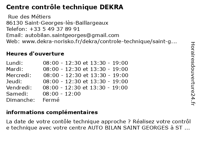 Description de l'entreprise :CONTROLE TECHNIQUE CATEGORIE LVotre centre de contrôle technique DEKRA, à Saint Georges les Baillargeaux, est agréer pour faire le contrôle technique de MOTO, SCOOTER, QUAD, VOITURE SANS PERMIS, VOITURE, SOLEX, 50cm3, VELO ELECTRIQUE IMMATRICULE, etc... prise de rendez-vous uniquement par téléphone, et aucun tarif ne sera communiqué. Dans l'attente de vous accueillir, votre équipe AUTO BILAN SAINT GEORGES Voir l'offre |