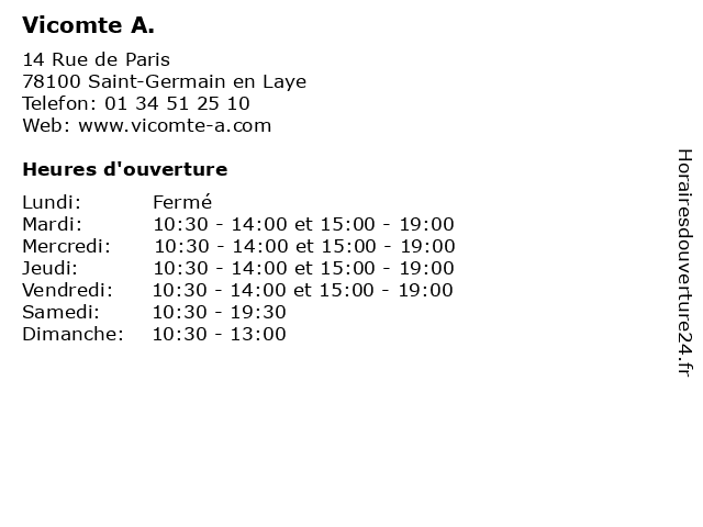 1 Vicomte A (Distance: 11,01 km) 1 rue du Président Kennedy, 78340 Les Clayes-sous-Bois accessoires, boutique, femme, homme, mode, vicomte, vêtements 2 Vicomte-A (Distance: 13,74 km) 20, rue de Chartres, 92200 Neuilly sur Seine accessories, blazer, children, jacket, men, scarf, vicomte, winter cloths, women 3 Vicomte A (Distance: 16,73 km) 5 rue La Boétie, 75008 Paris accessoires, boutique, femme, homme, mode, vicomte, vêtements 4 Vicomte A (Distance: 18,06 km) 40 rue du Dragon, 75006 Paris boutique, enfant, femme, homme, magasin, vicomte, vicomte a 5 Vicomte A. (Distance: 50,93 km) 3 Cours De La Garonne, 77700 Serris a., alimentation, beauté & santé, culture & loisirs, enfants, high-tech, mode, restaurants, vicomte 6 Daniela Vicomte - Naturopathe (Distance: 58,84 km) 4 Rue des Bleuets, 77390 Guignes daniela, docteur, naturopathe, sante, soins, vicomte |