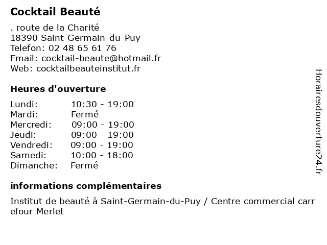 1 Milena Institut - Institut de beauté (Distance: 4,08 km) 115 Rue Amedée Bollée, 18230 Saint-Doulchard beauté, de, institut, manucure, milena, pédicure, saint-doulchard, salon 2 L'Ile de Beauté (Distance: 4,42 km) 25 Rue du Marechal Leclerc, 18230 Saint-Doulchard beaute, beauté, de, institut, l'ile, produits, sante 3 Naturel Beauté Institut (Distance: 4,54 km) - Rue Raymond Boisdé, 18000 Bourges beauté, institut, manucure, massage, naturel, soins, épilation 4 Perle & Beauté (Distance: 4,81 km) 115 rue de Vauver, 18000 Bourges beauté, instituts de beauté, perle, soins esthétiques 5 La-Nymphe-de-Beauté (Distance: 5,04 km) 8 Rue Luis Bunuel, 18000 Bourges beauté, bien-etre, de, institut, la, nymphe, produits, santé, soins, épilation 6 Diety'Vital'Beauté (Distance: 5,26 km) 294 Route des Racines, 18230 Saint-Doulchard diety'vital'beauté |