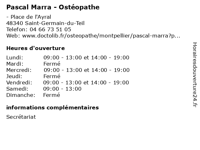 1 Nadege Marra - Naturopathe (Distance: 0,00 km) - Place de l'Ayral, 48340 Saint-Germain-du-Teil marra, medecin, nadege, naturopathe, plante, sante 3 Anaïs Vayssade - Ostéopathe (Distance: 15,47 km) - Rue Rivié, 12130 Saint-Geniez-d'Olt anaïs, ostéo, ostéopathe, ostéopathes, soins, vayssade 4 Jérémy Chenu - Ostéopathe (Distance: 26,23 km) 13 Boulevard Henri Bourrillon, 48000 Mende cabinet, chenu, jérémy, ostéopathe, ostéopathie, santé, thérapeutique, thérapie 5 Lena Rubio - Ostéopathe (Distance: 26,36 km) 2 Place René Estoup, 48000 Mende lena, ostéo, ostéopathe, ostéopathes, rubio, soins 6 Carole Roger - Ostéopathe (Distance: 29,84 km) 114 Avenue de Rodez, 12310 Laissac carole, ostéo, ostéopathe, ostéopathes, roger, soins |