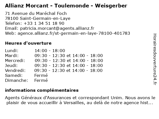 1 Allianz Morcant - Toulemonde - Weisgerber (Distance: 14,38 km) 21 Rue du Général Leclerc, 78000 Versailles allianz, morcant, toulemonde, weisgerber 2 Allianz (Distance: 0,49 km) 50 Rue des Louviers, 78100 Saint-Germain-en-Laye agence, allianz, assurances, vehicules 3 Allianz (Distance: 10,22 km) 52 Rue Maurice Bertheaux, 78700 Conflans Sainte Honorine agence, allianz, assurances 4 Maître Sophie Weisgerber - Avocate (Distance: 11,01 km) 3 Rue de Marly, 78000 Versailles avocate, avocats, civils, droits, juridiques, maître, sophie, weisgerber 6 Allianz (Distance: 13,61 km) 5 Place Colbert, 78885 Saint-Quentin allianz, cafe, enfants, homme, mode femme, restaurant, servicies |
