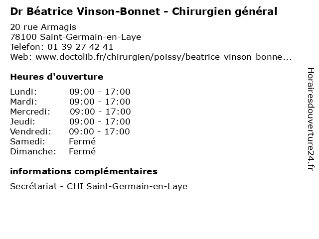 1 Dr Béatrice Vinson-Bonnet - Chirurgien général (Distance: 5,03 km) 10 Rue du Champ Gaillard, 78300 Poissy beatrice, bonnet, béatrice, chirurgien, docteur, dr, général, vinson 2 Dr Andrew Gumbs - Chirurgien général (Distance: 0,01 km) 20 Rue Armagis, 78100 Saint-Germain-en-Laye andrew, chirurgie, chirurgien, docteur, dr, gumbs, général 3 Michael Bonnet - Ostéopathe (Distance: 0,38 km) 2 Rue Gaucher, 78100 Saint-Germain-en-Laye bonnet, michael, osteo, osteopathe, ostéopathe, sante, soins 4 Lina Bonnet - Chirurgien-dentiste (Distance: 0,47 km) 27 Rue de Pologne, 78100 Saint-Germain-en-Laye bonnet, chirurgien, dentaire, dentiste, implantologie, lina, parodontologie 5 École élémentaire publique Général Leclerc (Distance: 1,53 km) 17 Rue du Raidillon, 78230 Le Pecq cours, education, général, leclerc, publique, services, école, élémentaire 6 Dr Béatrice Rime - Gynécologue médicale (Distance: 2,48 km) 46 Avenue de l'Amiral Lemonnier, 78160 Marly-le-Roi bebe, béatrice, dr, gynecologie, gynécologue, maternite, médicale, obstetrique, rime |
