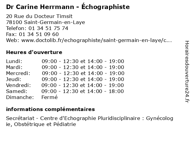1 Dr Carine Herrmann - Échographiste (Distance: 5,50 km) 10 Rue du Champ Gaillard, 78300 Poissy carine, consultation, docteur, dr, herrmann, med, médecin, médecine, traitement, échographiste 2 Dr Carine Herrmann - Échographiste (Distance: 7,88 km) 21 rue Moxouris, 78150 Le Chesnay carine, consultation, docteur, dr, herrmann, med, médecin, médecine, traitement, Échographiste 3 Dr Carine Cuccaroni - Médecin généraliste (Distance: 0,01 km) 20 Rue du Docteur Timsit, 78100 Saint-Germain-en-Laye carine, consultation, cuccaroni, docteur, dr, généraliste, med, médecin, traitement 4 Sonia Boggiani - Sage-femme échographiste (Distance: 6,03 km) 13-15 Rue Amédée Bollée, 92500 Rueil-Malmaison boggiani, femme, naissance, rueil-malmaison, sage, sage-femme, sonia, échographiste 5 Amina Aboumouslim - Échographiste (Distance: 6,70 km) 27 Rue Lamartine, 78500 Sartrouville aboumouslim, amina, du, maternité, périnée, rééducation, uro-gynécologique, Échographiste 6 Dr Richard Beddock - Échographiste (Distance: 11,12 km) 67 Avenue Foch, 92250 La Garenne-Colombes beddock, consultation, docteur, dr, med, médecin, médecine, richard, traitement, échographiste |