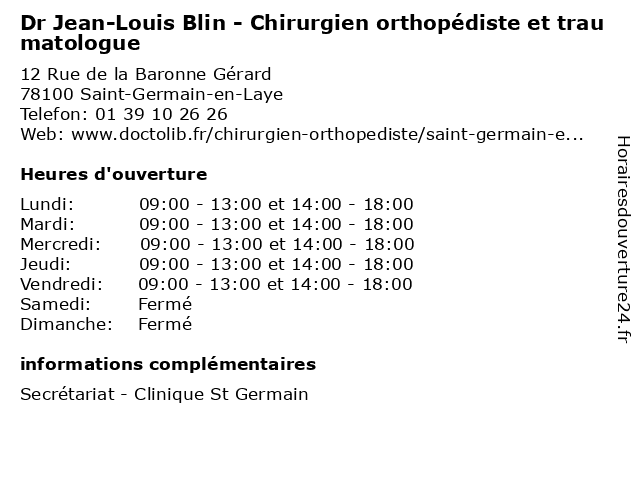 1 Dr Bruno Barbato - Chirurgien orthopédiste et traumatologue (Distance: 0,00 km) 12 Rue de la Baronne Gérard, 78100 Saint-Germain-en-Laye barbato, bruno, chirurgie, chirurgien, dr, et, general, orthopédiste, soins, traumatologue 2 Dr Bashar Kassis - Chirurgien orthopédiste et traumatologue (Distance: 0,02 km) 12 Rue de la Baronne Gérard, 78100 Saint-Germain-en-Laye bashar, chirurgien, dr, et, kassis, orthopédiste, traumatologue 3 Dr Alain Michaud - Chirurgien orthopédiste et traumatologue (Distance: 0,02 km) 12 Rue de la Baronne Gérard, 78100 Saint-Germain-en-Laye alain, chirurgien, dr, et, michaud, orthopédiste, traumatologue 4 Dr Louis Vilcoq - Médecin du sport (Distance: 0,10 km) 20 rue Armagis, 78100 Saint-Germain-en-Laye consultation, docteur, dr, du, louis, med, médecin, sport, traitement, vilcoq 5 Dr René Louis Vitte - Gastro-entérologue et hépatologue (Distance: 0,10 km) 20 Rue Armagis, 78100 Saint-Germain-en-Laye dr, enterelogue, entérologue, et, gastro, hepatolgue, hépatologue, louis, rené, soins, vitte 6 Medecin Jean Louis Morizot (Angiologue) (Distance: 0,52 km) 37 Rue de Lorraine, 78100 Saint-Germain-en-Laye angiologue, docteur, jean, louis, medecin, morizot, sante, services |