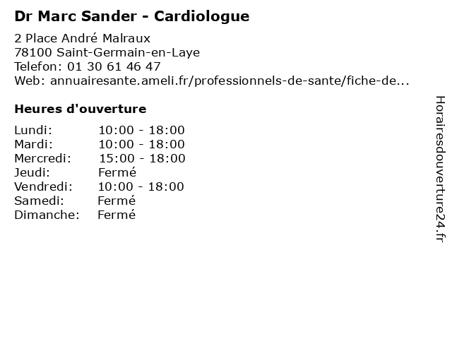 1 Dr Marc Waked - Médecin généraliste (Distance: 0,05 km) 14 Place Charles de Gaulle, 78100 Saint-Germain-en-Laye docteur, dr, generaliste, généraliste, marc, medical, médecin, soin, waked 2 Lelievre Marc (Distance: 0,16 km) 8 Rue De La Salle, 78100 St Germain En Laye lelievre, marc, restaurants 3 Karl Marc John (Distance: 0,23 km) 21-23 Rue au Pain, 78100 Saint Germain En Laye chaussures, enfants, femme, john, karl, marc, mode 4 Dr Marc Brami - Cardiologue (Distance: 2,11 km) 9 avenue de Saint-Germain, 78560 Le Port-Marly brami, cardiologue, dr, marc, médecins, médicaments, santé, secrétariat, spécialiste 5 Marc Orian (Distance: 3,25 km) . Route de Mantes 13, 78240 Chambourcy boutique, cafe, enfants, homme, lingerie, marc, mode femme, orian, restaurant 6 Marc Orian (Distance: 3,94 km) . Chambourcy, 78240 Chambourcy beaute, cafe, chaussures, enfants, hommes, lingerie, marc, mode femmes, orian, restaurant, sport |
