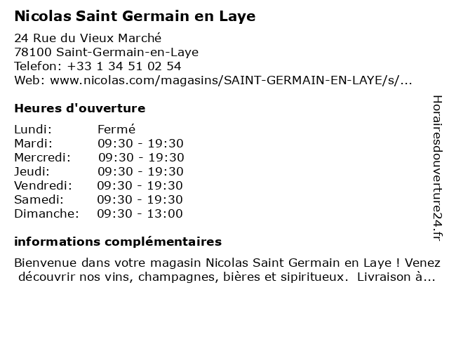 1 Nicolas (Distance: 0,00 km) 24 Rue du Vieux Marché, 78100 Saint Germain En Laye champagnes, hyper-supermarchés, nectars, nicolas, vente au détail de vin, vin 2 Nicolas Masson - Ostéopathe (Distance: 1,59 km) 6 Rue Jean Baptiste Lulli, 78100 Saint-Germain-en-Laye cervicalgie, dorsalgie, kinésithérapeute, lombalgie, masson, nicolas, os, ostéopathe 3 Nicolas (Distance: 2,09 km) - Avenue de l'Amiral Lemonnier, 78160 Marly Le Roi champagnes, hyper-supermarchés, nectars, nicolas, vente au détail de vin, vin 4 Nicolas (Distance: 2,98 km) . Route de Mantes 13, 78240 Chambourcy boutique, cafe, enfants, homme, lingerie, mode femme, nicolas, restaurant 5 Nicolas (Distance: 3,66 km) . Chambourcy, 78240 Chambourcy beaute, cafe, chaussures, enfants, hommes, lingerie, mode femmes, nicolas, restaurant, sport 6 Nicolas (Distance: 7,88 km) . Avenue Charles de Gaulle, 78158 Le Chesnay beaute, cafe, chaussures, enfants, lingerie, mode femmes, mode hommes, nicolas, restaurant, sport |