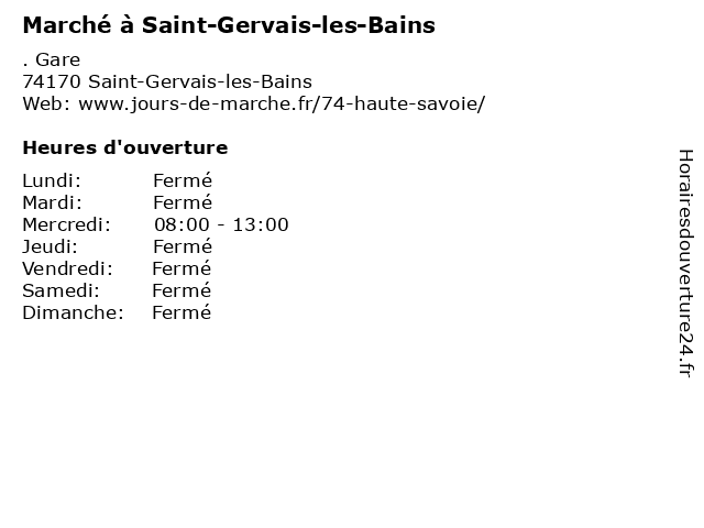 1 Marché à Saint-Gervais-Les-Bains (Distance: 0,64 km) . Le Fayet, 74190 Saint-Gervais-les-Bains bains, frutas, gervais, hortalizas, les, marché, mercado, saint, verduras 2 Marché à Saint-Gervais-Les-Bains (Distance: 1,57 km) . Promenade du Mont-Blanc, 74170 Saint-Gervais-les-Bains bains, frutas, gervais, hortalizas, les, marché, mercado, saint, verduras 3 Bistrot du marché Domancy (Distance: 1,54 km) 119 Zone Commerciale de la Pallud, 74700 Domancy bistrot, domancy, du, marché 4 Marché à Passy (Distance: 2,19 km) . Chedde, 74190 Passy frutas, hortalizas, marché, mercado, passy, verduras 5 Marché à Combloux (Distance: 6,62 km) . Ville, 74920 Combloux combloux, frutas, hortalizas, marché, mercado, verduras 6 Marché à Megève (Distance: 7,97 km) . Place du Village, 74120 Megéve frutas, hortalizas, marché, megève, mercado, verduras  |