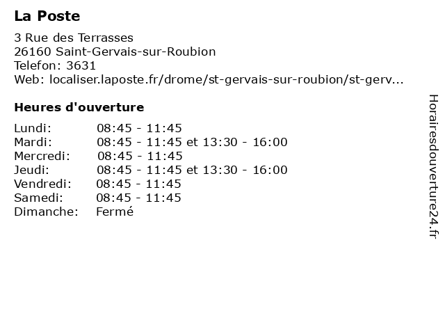 2 La Poste (Distance: 4,68 km) - Route de Montélimar, 26160 Pont-de-Barret agence, assurance, banque, banque postale, bureau de poste, chronopost, colis, courrier, dps, expéditions internationales, la, point, postale, poste, relais, timbres, téléphonie, ups, western union 4 La Poste (Distance: 4,82 km) - Boulevard de Provence, 26450 Cléon-d'Andran agence, assurance, banque, banque postale, bureau de poste, chronopost, colis, courrier, dps, expéditions internationales, la, point, postale, poste, relais, timbres, téléphonie, ups, western union 6 La Poste (Distance: 6,89 km) - Rue Albin Davin, 26740 Marsanne agence, assurance, banque, banque postale, bureau de poste, chronopost, colis, courrier, dps, expéditions internationales, la, point, postale, poste, relais, timbres, téléphonie, ups, western union |