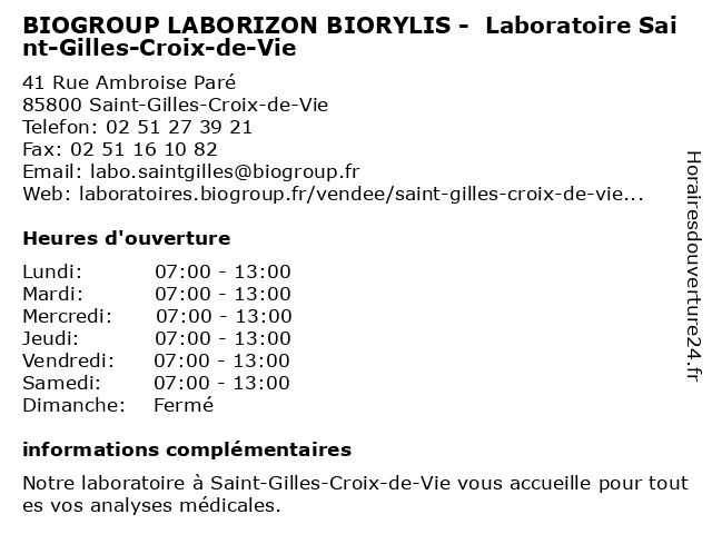 1 Activbiolab - Laboratoire de Biologie Médicale (Distance: 1,78 km) 41-43 quai Gorin, 85800 Saint-Gilles Croix de Vie activbiolab, analyses, biologie, covid, de, laboratoire, medicale, medicales, médicale, services 2 Laboratoire d'analyses médicales - Saint-Jean-de-Monts - Cerballiance (Distance: 15,58 km) 5 Pl. Ernest Guérin, 85160 Saint-Jean-de-Monts cerballiance, d'analyses, de, dépistages, jean, laboratoire, monts, médicales, saint 3 Laboratoire d'analyses médicales - Challans - Cerballiance (Distance: 17,00 km) 2 Rue Du Maréchal De Lattre De Tassigny, 85300 Challans cerballiance, challans, d'analyses, dépistages, laboratoire, médicales 4 LABORIZON BIORYLIS - Laboratoire Pôle Santé des Olonnes (Distance: 23,55 km) Rue Jacques Monod, 85340 Olonne-sur-Mer analyse de sang, biorylis, coronavirus, covid19, des, laboratoire, laboratoire d analyse médicale, laborizon, olonnes, prise de sang, pôle, résultats, santé, sérologie, test covid, test pcr 5 LABORIZON BIORYLIS - Laboratoire Les Salines (Distance: 24,10 km) 17 Avenue du Général de Gaulle, 85100 Les Sables-d'Olonne analyse de sang, biorylis, coronavirus, covid19, laboratoire, laboratoire d analyse médicale, laborizon, les, prise de sang, résultats, salines, sérologie, test covid, test pcr 6 LABORIZON BIORYLIS - Laboratoire Gutenberg La Roche Sur Yon (Distance: 37,09 km) 22 Rue Gutenberg, 85000 La Roche-sur-Yon analyse de sang, biorylis, coronavirus, covid19, gutenberg, la, laboratoire, laboratoire d analyse médicale, laborizon, prise de sang, roche, résultats, sur, sérologie, test covid, test pcr, yon |