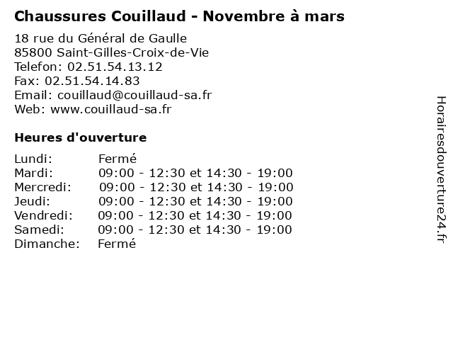 1 Chaussures Couillaud - Juillet et Août (Distance: 0,00 km) 18 Rue du Général de Gaulle, 85800 Saint Gilles Croix de Vie adulte, août, chaussures, couillaud, enfants, et, juillet, magasins, marques, été 2 Chaussures Couillaud - Avril à juin et septembre (Distance: 0,00 km) 18 rue du Général de Gaulle, 85800 Saint-Gilles-Croix-de-Vie adulte, avril, chaussures, couillaud, enfants, et, juin, magasins, marques, septembre 3 Hôtel Port la Vie - Réception novembre à avril (Inter-Hôtel) (Distance: 0,49 km) 16-18 Avenue Notre Dame, 85800 Saint-Gilles-Croix-de-Vie avril, de, hebergement, hotel, hôtel, inter, la, novembre, port, réception, vie 4 La Novità - Mars et octobre (Distance: 0,70 km) 14 avenue Maurice Perray, 85800 Saint Gilles Croix de Vie et, italien, la, mars, novit, novità, octobre, pizzéria, restaurants 5 Couillaud Célestin (Distance: 2,95 km) 12 Avenue de l'Isle de Riez, 85270 Saint-Hilaire-de-Riez couillaud, célestin 6 Le Moulin des Gourmands - octobre à mars (Distance: 8,54 km) - Rue René Bazin, 85220 Saint-Révérend alimentation, brasserie, des, gourmands, le, mars, moulin, octobre, parking, restaurant, terrasse |