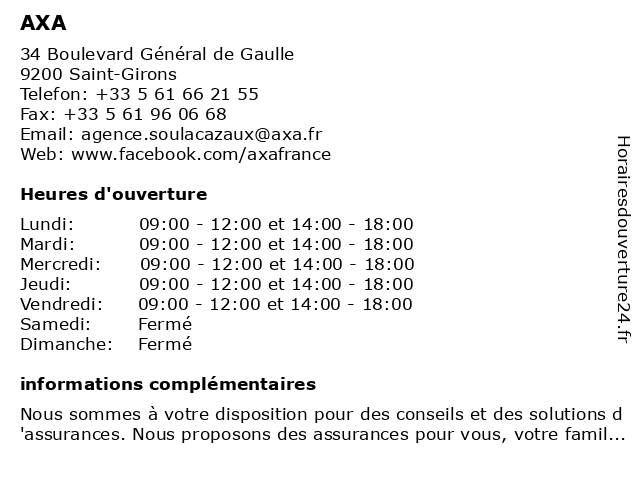 1 AXA Assurance et Banque Soula Cazaux (Distance: 0,01 km) 34 Boulevard Général de Gaulle, 09200 Saint-Girons assurance, assurance appartement, assurance auto, assurance entreprise, assurance epargne, assurance habitation, assurance maison, assurance professionnelle, assurance santé, assurance voiture, axa, banque, cazaux, et, soula 2 Axa Assurance (Distance: 0,49 km) 73 Boulevard Frederic Arnaud, 09200 Saint Girons assurance, assurance pret, assurances, axa, services 3 Axa Assurance (Distance: 0,60 km) 2 Rue Jules Desbiaux, 09200 Saint Girons assurance, assurance pret, assurances, axa, services 4 AXA Assurance et Banque Carole Casteras (Distance: 0,67 km) 31 Rue Pierre Mazaud, 09200 Saint-Girons assurance, assurance appartement, assurance auto, assurance entreprise, assurance epargne, assurance habitation, assurance maison, assurance professionnelle, assurance santé, assurance voiture, axa, banque, carole, casteras, et 5 Axa Assurance (Distance: 0,69 km) 31 Rue De La Republique, 09200 Saint Girons assurance, assurance pret, assurances, axa, services 6 AXA Assurance et Banque Adelaide Lachevre (Distance: 3,13 km) Route de Toulouse, 09190 Saint-Lizier adelaide, assurance, assurance appartement, assurance auto, assurance entreprise, assurance epargne, assurance habitation, assurance maison, assurance professionnelle, assurance santé, assurance voiture, axa, banque, et, lachevre |
