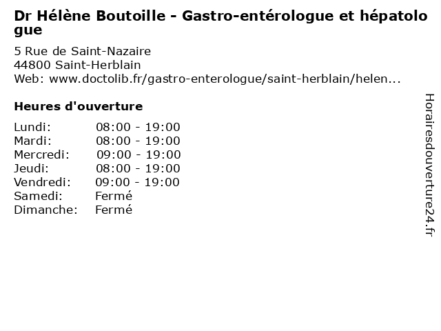 1 Dr Jean-Jacques Tassou - Gastro-entérologue et hépatologue (Distance: 0,00 km) 5 Rue de Saint-Nazaire, 44800 Saint-Herblain consultation, docteur, dr, entérologue, et, gastro, hépatologue, jacques, jean, med, médecin, médecine, secrétariat, tassou, traitement 2 Dr Patricia Petit - Gastro-entérologue et hépatologue (Distance: 0,00 km) 5 Rue de Saint-Nazaire, 44800 Saint-Herblain consultation, docteur, dr, entérologue, et, gastro, hépatologue, med, médecin, médecine, patricia, petit, secrétariat, traitement 3 Dr Philippe Hemery - Gastro-entérologue et hépatologue (Distance: 0,00 km) 5 Rue de Saint-Nazaire, 44800 Saint-Herblain consultation, docteur, dr, entérologue, et, gastro, hemery, hépatologue, med, médecin, médecine, philippe, secrétariat, traitement 4 Dr Carole Cordonnier - Gastro-entérologue et hépatologue (Distance: 0,00 km) 5 Rue de Saint-Nazaire, 44800 Saint-Herblain carole, consultation, cordonnier, docteur, dr, entérologue, et, gastro, hépatologue, med, médecin, médecine, secrétariat, traitement 5 Medecin Patricia Petit (hépatologue) (Distance: 0,02 km) 5 Rue de Saint-Nazaire, 44800 Saint-Herblain docteur, hépatologue, medecin, patricia, petit, sante, services 6 Medecin Patricia Petit - Horaires du Cabinet (hépatologue) (Distance: 0,02 km) 5 Rue de Saint-Nazaire, 44800 Saint-Herblain cabinet, docteur, du, horaires, hépatologue, medecin, patricia, petit, sante, services |