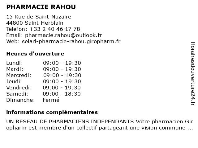 1 Pharmacie Touzé (Distance: 0,37 km) 55 boulevard Winston Churchill, 44800 Saint-Herblain aromatherapie, médical, médicaments, paramédical, parapharmacie, pharmacie, santé, touzé, traitements 2 Pharmacie Brousseau (Distance: 2,22 km) 78 Boulevard de l'Egalité, 44100 Nantes aromatherapie, brousseau, médical, médicaments, paramédical, parapharmacie, pharmacie, santé, traitements 3 Pharmacie de l'Hôtel de Ville - Pharmacien Giphar (Distance: 2,62 km) 17 Rue de l'Hôtel de Ville, 44800 Saint-Herblain de, giphar, l'hôtel, medicaments, parapharmacie, pharmacie, pharmacien, ville 4 Pharmacie du Nouveau Bourg (Distance: 2,83 km) 21 Rue du Lieutenant Mouillie, 44800 Saint Herblain bourg, du, herboristerie, médicaments, nouveau, paramédical, parapharmacie, pharmacie, pharmacien, santé, traitements 5 Pharmacie Bodic (Distance: 3,46 km) 1 Place René Bouhier, 44000 Nantes aromatherapie, bodic, médical, médicaments, paramédical, parapharmacie, pharmacie, santé, traitements 6 |