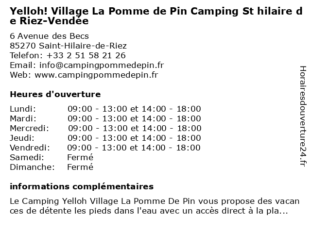 1 La Pomme de Pin (Distance: 0,00 km) 6 Avenue des Becs, 85270 Saint-Hilaire-de-Riez camping, de, glamping, hotel plein air, la, pin, pomme 2 Camping La Pomme de Pin (Réception, haute saison) (Distance: 0,00 km) 6 Avenue des Becs, 85270 Saint-Hilaire-de-Riez camping, de, haute, hebergement, la, pin, pomme, réception, saison, tourisme 3 Camping Homair - Le Domaine du Clarys (Distance: 0,22 km) 77 Avenue des Épines, 85160 Saint-Jean-de-Monts camping, camping animations, camping atlantique, camping bord de mer, camping club enfants, camping famille, camping france 5 étoiles, camping pays de la loire, camping saint jean de monts, camping vendée, camping vendée 5 étoiles, camping vendée parc aquatique, camping vendée piscine, clarys, domaine, du, homair, le 4 Camping Village de la Mer (Distance: 0,60 km) 118 A avenue de La Pège, 85270 Saint-Hilaire-de-Riez camping, caravaning, de, la, loisirs, mer, tourisme, vacances, village 5 Camping Le Chenal (Distance: 0,67 km) 78 Avenue des Épines, 85160 Saint-Jean-de-Monts camping, chenal, le 6 Village Vacances le Petit Bec (Réception, basse saison) (Distance: 1,29 km) 57 Avenue des Becs, 85270 Saint Hilaire de Riez basse, bec, hebergement, hotel, le, petit, réception, saison, vacances, village |
